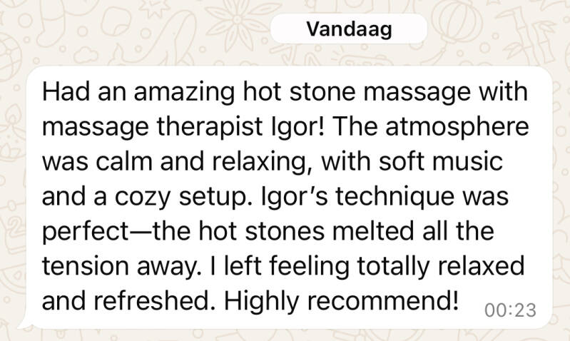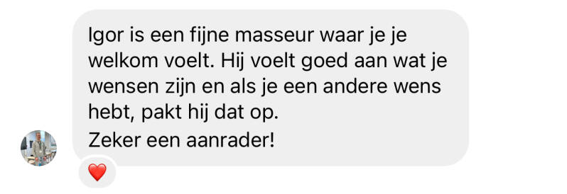 "Dankzij Igor's expertise en persoonlijke aanpak voel ik me herboren na elke massage. Een echte aanrader!"